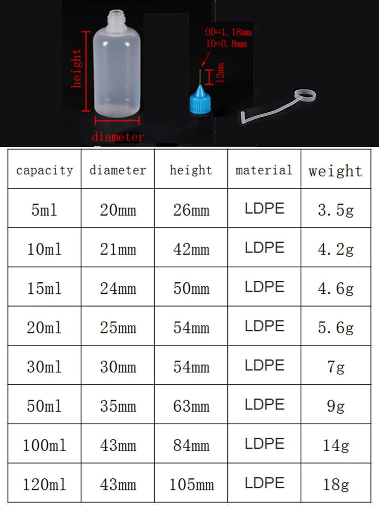 5ml 10ml 20ml 30ml 100ml 120ml PE Plastic Squeezable Tip Applicator Bottle Refillable Dropper with Needle Tip Caps Oil Bottles